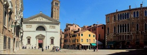 Qui siamo in Campo San Maurizio dove spesso si tengono mercatini d’antiquariato. La chiesa, in origine una delle più antiche di Venezia, venne distrutta e ricostruita quasi interamente da Napoleone nel 1806, e quindi non viene considerata di gran valore dai Veneziani. Il campanile che vedete in verità fa parte della Chiesa di Santo Stefano che sta oltre. Nel 1319 la parrocchia di San Maurizio fu al centro di un scandalo, quando il parroco assassinò un prete rivale per una faccenda di debiti. Il prete omicida fu condannato alla cheba, ossia fu relegato in una gabbia che venne poi appesa pubblicamente in alto al Campanile di San Marco, dove morì poco dopo di fame e di sete. Come sempre, lo Stato rendeva pubbliche le pene più orrende affinché qualsiasi malintenzionato ci pensasse due volte prima di compiere un crimine.